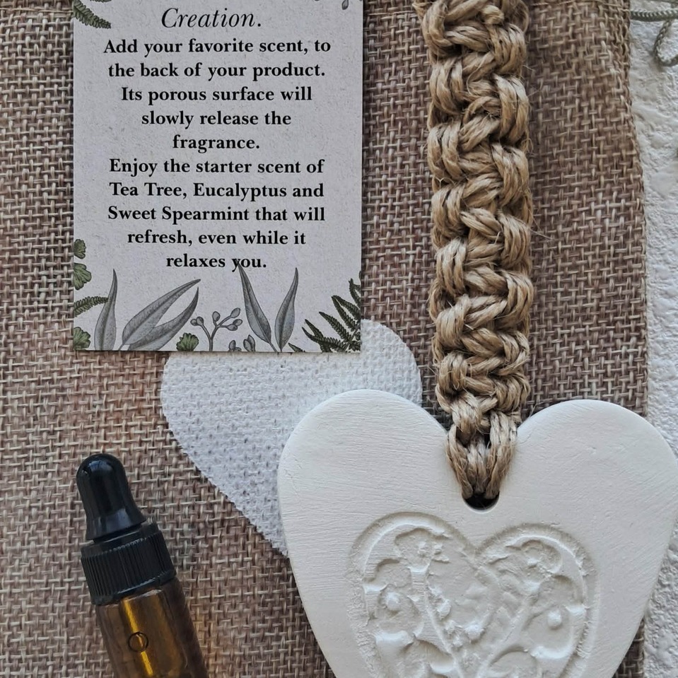 This beautiful vintage design will adorn any wall with beauty. Add your favorite oils or scent to the back to disperse. This set comes with a starter scent of Tea tree, rosemary and Eucalyptus oils.